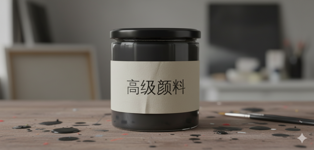 a glass can with plastic lid, black paint inside, wrapping paper writing "高级颜料" (as in the reference image)