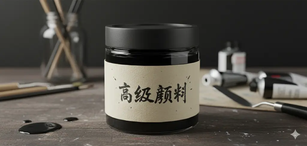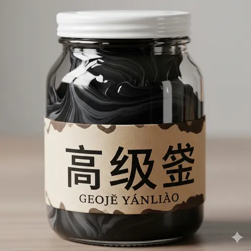 a glass can with plastic lid, black paint inside, wrapping paper writing "高级颜料" (as in the reference image, but turn it into a calligraphy style)
